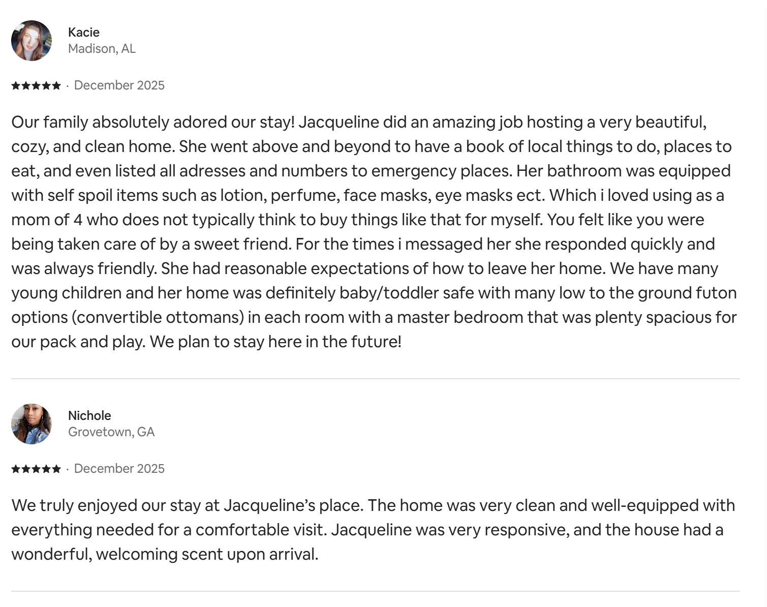 Hi there! I'm Jacqueline your primary host! I've been in the business of hosting families in the Fort Rucker/Wiregrass Area for over 5 years now but I have a long history here! As a retired Army Aviator, I know the woes of military moves and travelling for trainings where cramped hotel rooms are not the way I enjoy doing business anymore. I pride myself on keeping my homes impeccably clean, comfortable and also a little quirky because well....why not have some fun! I try to take my best travelling experiences and put them into every home so you can also have the same quality experience. Southern hospitality is a real thing here and I try my best to accommodate all requests!